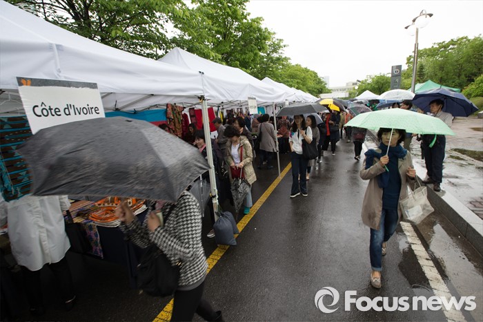 (서울=포커스뉴스) 3일 오전 서울 서초구 국립외교원에서 열린 외교부 배우자회 어려운 이웃돕기 자선바자회에서 시민들이 우산을 쓰고 각국의 물건을 구경하고 있다.