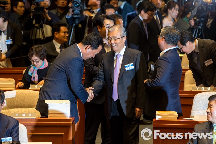 (서울=포커스뉴스) 김종인 더불어민주당 비상대책위 대표가 3일 오후 서울 여의도 국회에서 열린 '20대 국회의원 당선자 및 당무위원 연석회의'에 참석하기 위해 회의실로 들어서며 당선자들과 인사 하고 있다.