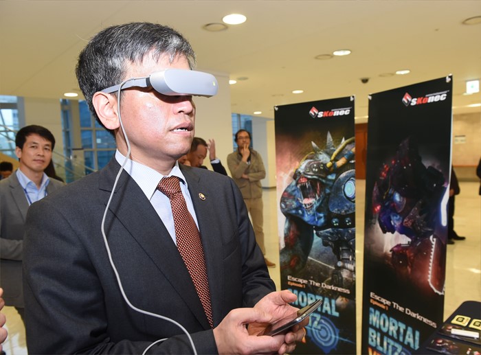 (서울=포커스뉴스) 최상목 기획재정부 차관이 3일 서울 마포구 상암동 누리꿈스퀘어에서 VR기기를 이용한 콘텐츠 시연을 하고 있다. <사진제공=산업통상자원부>