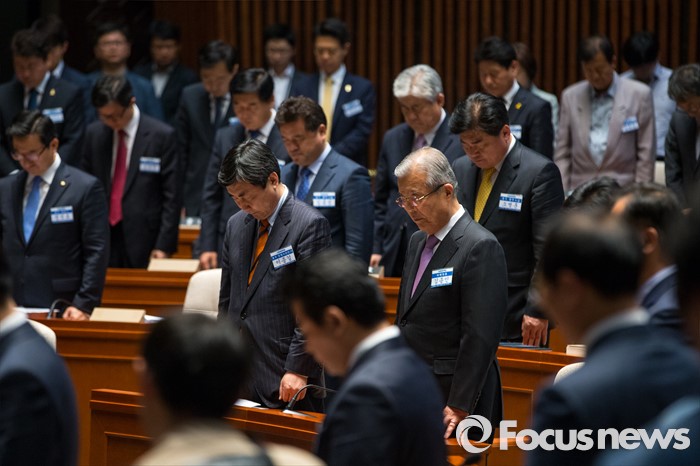 (서울=포커스뉴스) 김종인 더불어민주당 비상대책위 대표와 이종걸 더불어민주당 원내대표를 비롯한 당선자들이 3일 오후 서울 여의도 국회에서 열린 '20대 국회의원 당선자 및 당무위원 연석회의'에 참석해 묵념 하고 있다.