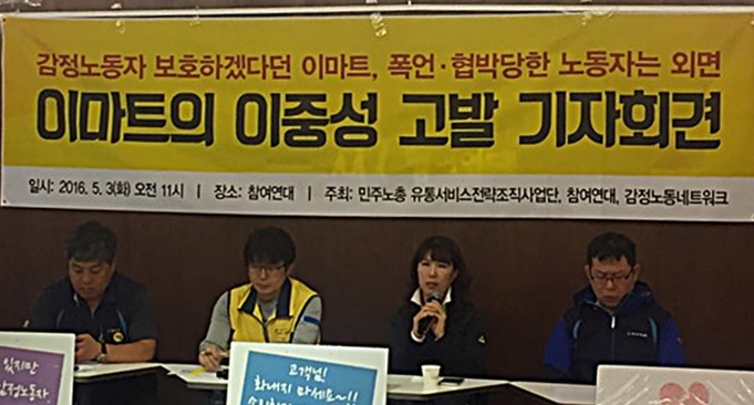 이마트 노동조합은 3일 오후 서울 종로구 참여연대 사무실에서 기자회견을 열고 노동자 보호에 대한 회사의 책임을 촉구했다.