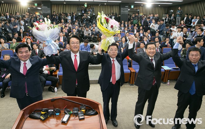(서울=포커스뉴스) 3일 오후 서울 여의도 국회에서 열린 새누리당 20대 국회 첫 원내대표 및 정책위의장 선출을 위한 당선자 총회에서 선출된 신임 원내지도부와 현 지도부가 손을 들어 포즈를 취하고 있다. 왼쪽부터 원유철 대표최고위원 권한대행, 정진석 신임 원내대표, 김광림 신임 정책위의장, 김정훈 전 정책위의장, 신상진 선거관리위원장.