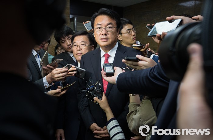 (서울=포커스뉴스) 3일 오후 서울 여의도 국회에서 열린 새누리당 20대 국회 첫 원내대표 및 정책위의장 선출을 위한 당선자 총회에서 신임 원내대표로 선출 된 정진석 후보가 기자회견을 갖고 있다.