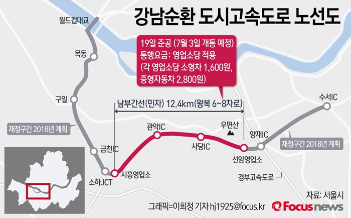 (서울=포커스뉴스) 서울시는 강남순환도로 민자구간을 오는 19일 준공하고 시운전 기간을 거쳐 7월3일 우선 개통한다고 3일 밝혔다. 강남순환도로는 서울 금천구 독산동과 서울 강남구 수서동을 연결하는 22.9km의 왕복 6~8차로 도시고속화도로다.