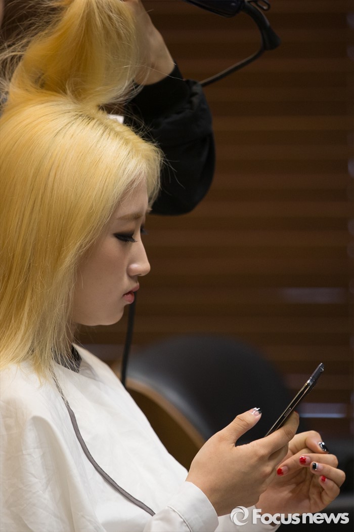 (서울=포커스뉴스) 3일 오후 서울 강남구 컬처앤네이처 청담점에서 걸그룹 솔티의 멤버 채희가 머리손질을 하고 있다. 솔티는 3일 오후 SBS MTV 생방송 더쇼를 통해 데뷔한 걸그룹 이다.
