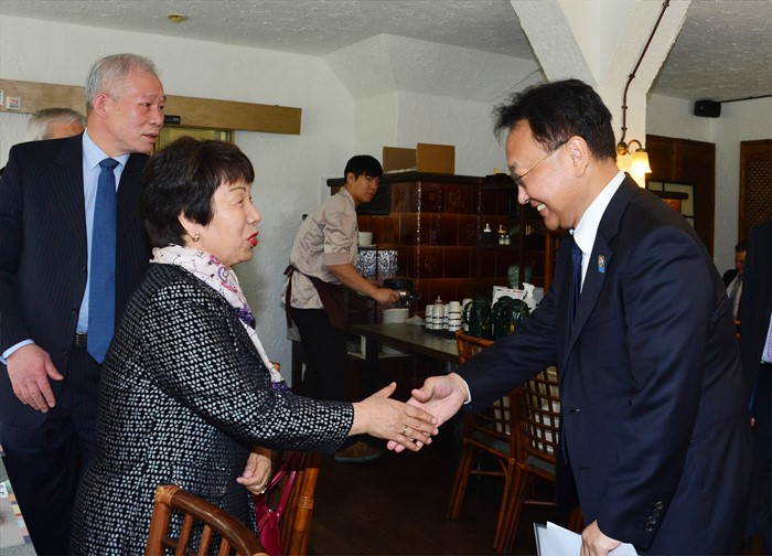 (서울=포커스뉴스) ADB 연차 총회 및 한중일 재무장관 회의 참석 차 독일을 방문 중인 유일호 부총리 겸 기획재정부 장관이 3일(현지시간) 프랑크푸르트 오버우워젤 지역에서 파독 교민 오찬 간담회에 참석해, 문정균 재독 한인 간호협회 부회장과 악수하며 인사를 나누고 있다. <사진제공=기획재정부>
