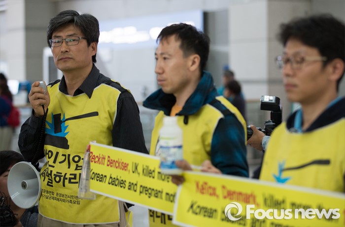 (인천공항=포커스뉴스) 4일 오전 인천국제공항 출국장에서 가습기 살균제 피해자 가족 모임과 환경보건시민센터 관계자들이 옥시레킷벤키저 영국 본사에 항의하기 위해 출국하기 전 기자회견을 하고 있다. 이들은 영국 런던에서 열리는 옥시레킷벤키저의 연례주주총회를 방문할 예정이다.