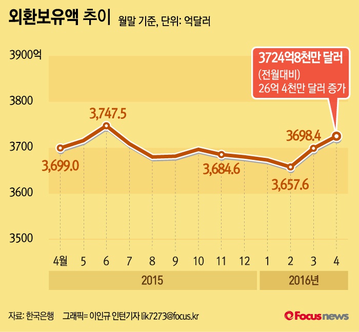 (서울=포커스뉴스) 4일 한국은행이 공개한 ‘2016년 4월 말 외환보유액’을 보면 지난달 외환보유액은 3월 말보다 26억4000만달러 증가한 3724억8000만달러를 기록했다.