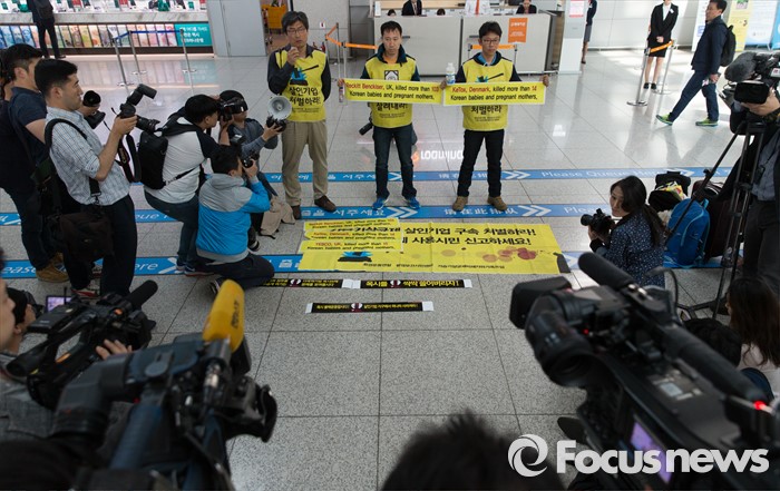 (인천공항=포커스뉴스) 4일 오전 인천국제공항 출국장에서 가습기 살균제 피해자 가족 모임과 환경보건시민센터 관계자들이 옥시레킷벤키저 영국 본사에 항의하기 위해 출국하기 전 기자회견을 하고 있다. 이들은 영국 런던에서 열리는 옥시레킷벤키저의 연례주주총회를 방문할 예정이다.