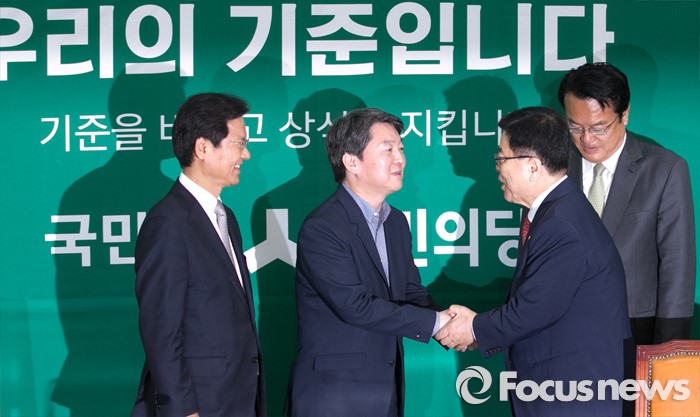 (서울=포커스뉴스) 새누리당 신임 원내지도부가 4일 오전 서울 여의도 국회에서 국민의당 지도부를 예방, 인사하고 있다. 오른쪽부터 정진석 새누리당 신임 원내대표, 김광림 신임 정책위의장, 안철수 국민의당 상임공동대표, 천정배 공동대표.
