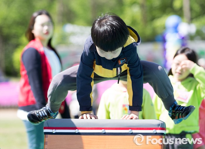 (서울=포커스뉴스) 어린이날을 하루 앞둔 4일 오전 서울 마포구 월드컵공원 난지잔디광장에서 2016 마포어린이축제에 참가한 어린이가 뜀틀을 넘고 있다.