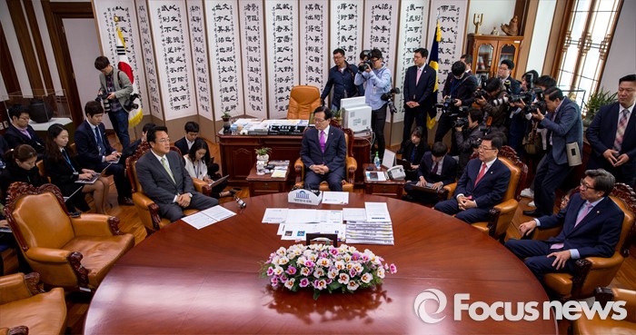 (서울=포커스뉴스) 정의화(가운데) 국회의장이 4일 오전 서울 여의도 국회에서 정진석(왼쪽) 새누리당 신임 원내대표와 면담 하고 있다.