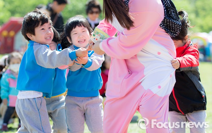 (서울=포커스뉴스) 어린이날을 하루 앞둔 4일 오전 서울 마포구 월드컵공원 난지잔디광장에서 2016 마포어린이축제에 참가한 어린이들이 선생님의 옷을 잡아당기며 장난치고 있다.