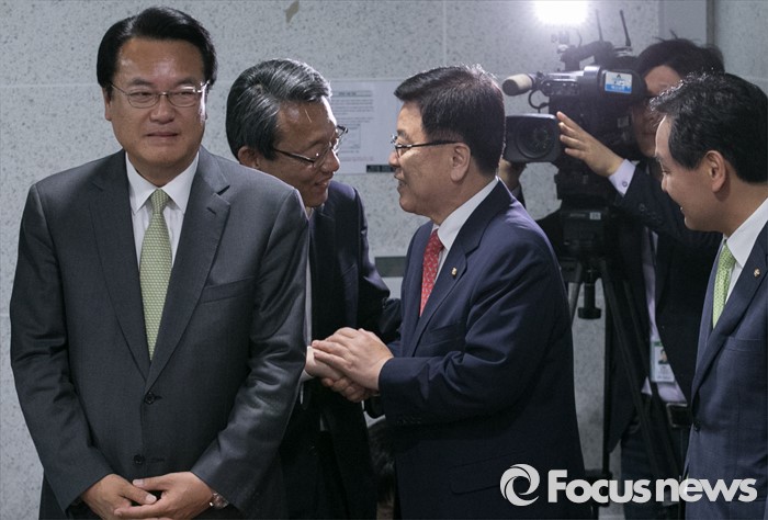 (서울=포커스뉴스) 새누리당 신임 원내지도부가 4일 오전 서울 여의도 국회 의원회관에서 국민의당 원내지도부를 예방, 인사하고 있다. 오른쪽부터 김관영 국민의당 원내수석부대표, 김광림 새누리당 신임 정책위의장, 김성식 국민의당 정책위의장, 정진석 새누리당 신임 원내대표.