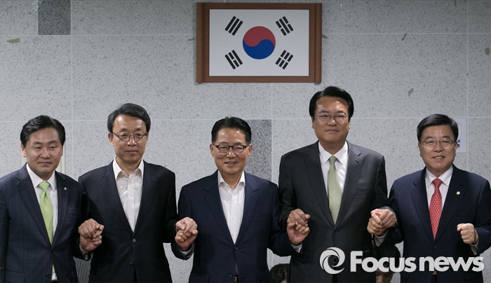 (서울=포커스뉴스) 새누리당 신임 원내지도부가 4일 오전 서울 여의도 국회 의원회관에서 국민의당 원내지도부를 예방, 취재진을 향해 포즈를 취하고 있다. 오른쪽부터 김광림 새누리당 신임 정책위의장, 정진석 신임 원내대표, 박지원 국민의당 원내대표, 김성식 정책위의장, 김관영 원내수석부대표.