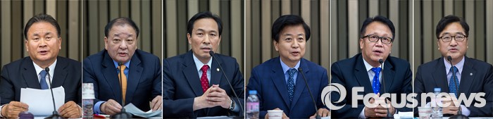 (서울=포커스뉴스) 4일 오전 서울 여의도 국회에서 열린 '원내대표 선거 합동 토론회'에서 후보들이 토론을 하고 있다. 왼쪽부터 기호순으로 이상민 의원, 강창일 의원, 우상호 의원, 노웅래 의원, 민병두 의원, 우원식 의원.
