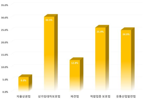 상가임대차보호법에 이어 소상공인들은 적합업종보호법(25.9%)과 유통산업발전법(24.9%), 파견법(12.8%), 자율상권법(6.0%) 등을 19대 국회에서 처리해 주길 원했다.