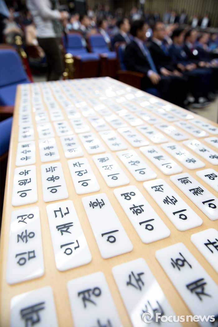 (서울=포커스뉴스) 4일 오후 서울 여의도 국회에서 열린 더불어민주당 원내대표선거에서 선거인 명패가 놓여져 있다.
