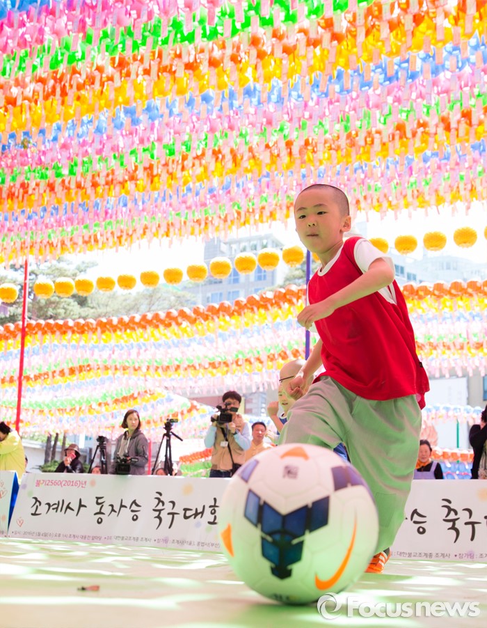 (서울=포커스뉴스) 4일 오후 서울 종로구 조계사 대웅전 앞에서 조계사와 홍법사 동자스님들이 축구대회에 참가해 실력을 겨루고 있다.