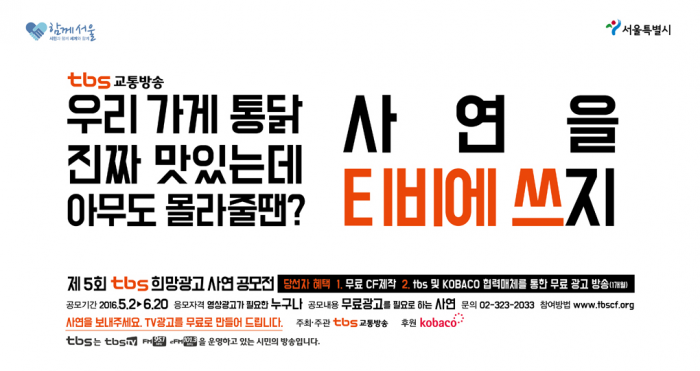 지난 2일부터 시작된 tbs 희망광고 사연 공모전은 오는 6월20일까지 50일간 진행된다. 이번 공모전은 개인뿐 아니라 중소기업, 소상공인, 전통시장 상인, 사회적 기업, 협동조합, 예술가 집단, 사회적 취약계층 창업자 등 영상광고를 필요로 하는 대한민국 국민․단체라면 누구나 참여 가능하다.