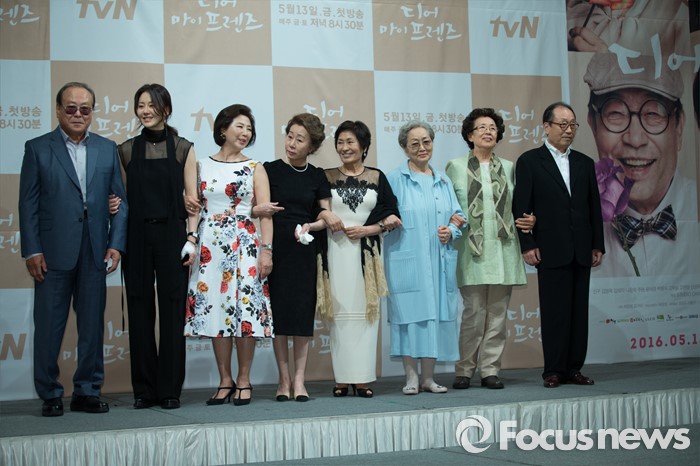 (서울=포커스뉴스) 4일 오후 서울 강남구 임피리얼 팰리스 호텔에서 열린 tvN 10주년 특별기획 '디어 마이 프렌즈' 제작발표회에 참석한 배우 주현(왼쪽부터), 고현정, 고두심, 윤여정, 김혜자, 김영옥, 나문희, 신구가 포토타임을 갖고 있다.