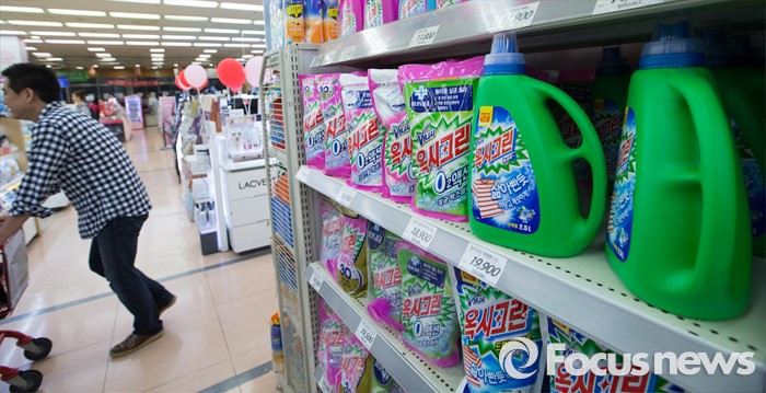 시중에 유통되고 있는 옥시 제품은 △옥시크린, 오투액션 등 세제류△쉐리 섬유유연제△에어윅과 물먹는 하마 등 방향제△이지오프 뱅과 옥시싹싹 등 청소용품△데톨 세정제△비트 제모크림△개비스콘 등이다.(서울=포커스뉴스) 3일 오전 서울 시내 한 마트에 옥시레킷벤키저 제품들이 진열되어 있다. 지난 2일 아타울라시드 사프달 옥시 대표가 가습기살균제 사건 관련 사과 했지만 피해자 가족과 단체들은 옥시의 사과를 거부하며 1인 시위, 고발장 접수 등 거세게 반발했다. 2016.05.03 오장환 기자