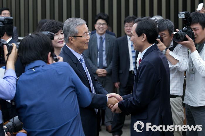 | △ 김종인 축하받는 우상호 |