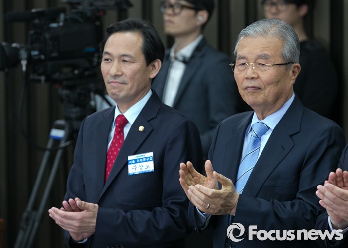(서울=포커스뉴스) 4일 오후 서울 여의도 국회에서 열린 더불어민주당 20대 국회 1기 원내대표 선출을 위한 당선자 총회에 참석한 김종인(오른쪽) 비대위 대표와 우상호 신임 원내대표가 박수치고 있다.