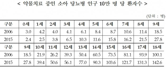 4일 국민건강보험공단(이사장 성상철)이 2006년부터 2015년까지 10개년 건강보험 지급자료를 분석한 결과에 따르면, 당뇨병으로 약물치료 중인 18세 이하 소아 환자는 2006년 4076명에서 2015년 5338명으로 31.0% 증가했다.