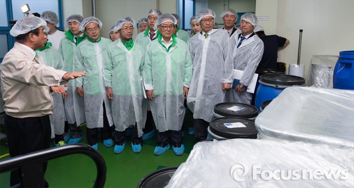 (인천=포커스뉴스) 박지원 국민의당 원내대표를 비롯한 20대 총선 당선인들이 4일 오후 인천 남동구 (주)서울화장품 인천공장에서 열린 국민의당 정책역량강화 집중 워크샵 '중소기업 대표 및 근로자와의 간담회'에서 화장품 제조 라인을 둘러보고 있다.
