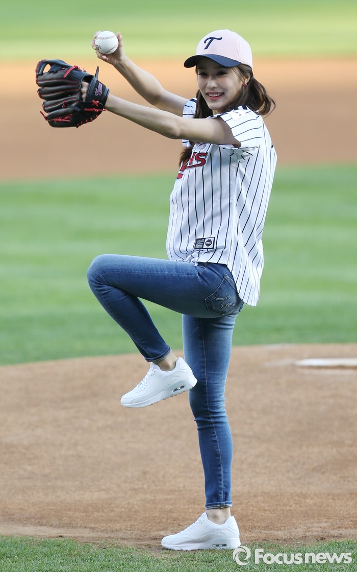 (서울=포커스뉴스) 4일 서울 잠실구장에서 열린 2016 프로야구 두산-LG 경기에 앞서 '캐리와 장난감 친구들'의 캐리가 시구하고 있다.