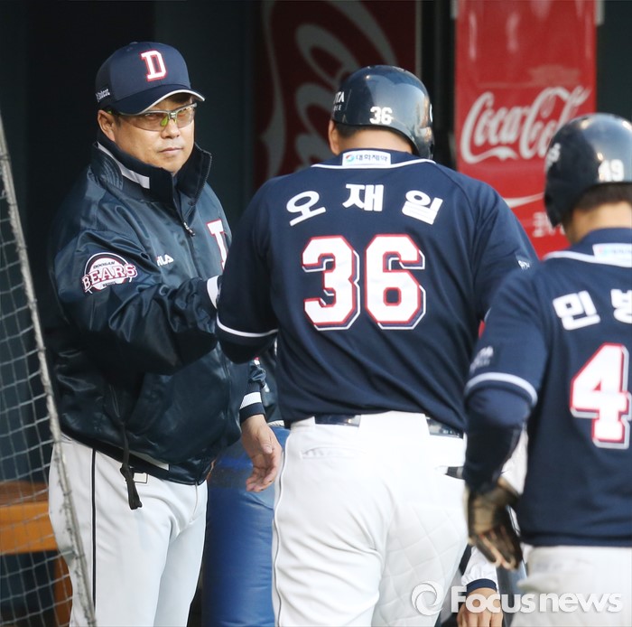 (서울=포커스뉴스) 4일 서울 잠실구장에서 열린 2016 프로야구 두산-LG 경기 1회초 두산 김태형 감독이 우월 2점 홈런을 친 오재일을 덕아웃에서 환영하고 있다.