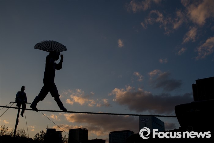 (서울=포커스뉴스) 4일 오후 서울시청 광장에서 열린 '광대 줄타기 연희 한마당'에서 솟대쟁이패 단원들이 줄타기 공연을 하고 있다.