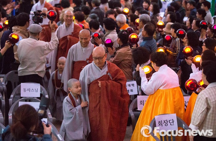 (서울=포커스뉴스) 4일 오후 서울 종로구 조계사에서 열린 연등 점등식 행사장에 동자승들이 참석하고 있다.