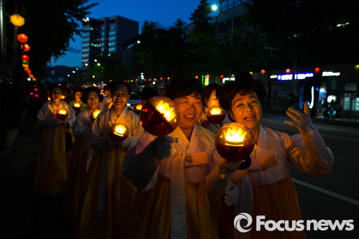 (서울=포커스뉴스) 4일 오후 서울 종로구 조계사에서 열린 연등 점등식에 참석한 불자들이 점등식 후 거리 행진을 하고 있다.