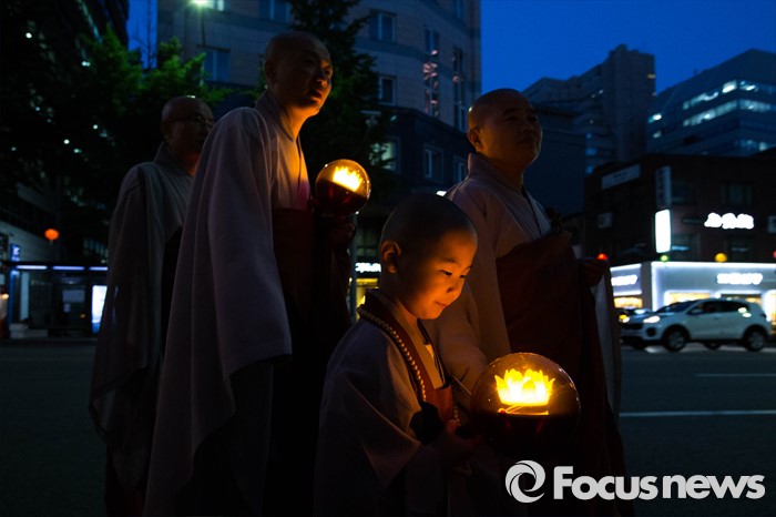 (서울=포커스뉴스) 조계사 스님과 동자승들이 4일 오후 서울 종로구 조계사에서 열린 연등 점등식이 끝나고 거리 행진을 하고 있다.