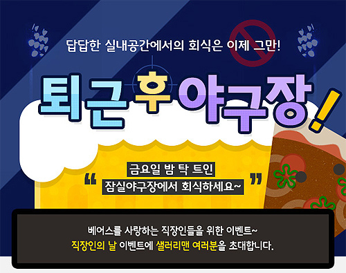 클리닝타임에는 1루 응원단상에서 '쌤소나이트와 함께하는 맥주 빨리 마시기' 이벤트를 열어 1등팀 전원에게 쌤소나이트 브리프케이스를 선물한다. 사전 신청을 통해 직장인 단체 환영메시지도 제공한다.프로야구 두산이 6일 잠실구장에서 열리는 롯데와의 홈경기 '직장인의 날' 행사를 연다. 사진은 행사 이미지. <사진제공=두산 베어스>
