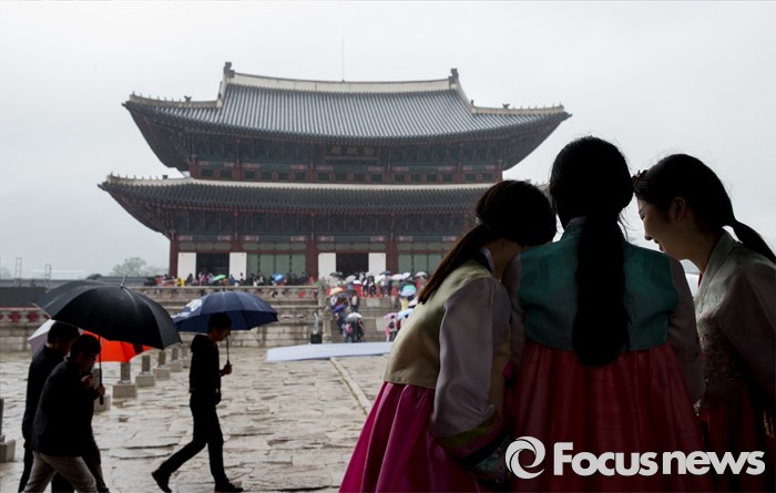 (서울=포커스뉴스) 임시공휴인인 6일 오후 서울 경복궁을 찾은 시민 및 관광객들이 궂은 날씨 속에 궐내 경치를 즐기고 있다.