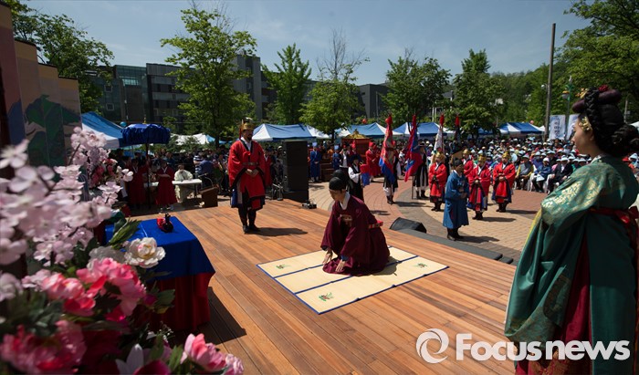 (서울=포커스뉴스) 7일 오전 서울 구로구 궁동저수지생태공원에서 '정선옹주 시집가는 날' 참가자들이 전통혼례를 재현하고 있다. 정선옹주는 조선 14대 임금인 선조와 후궁 정빈 민씨의 딸이다.