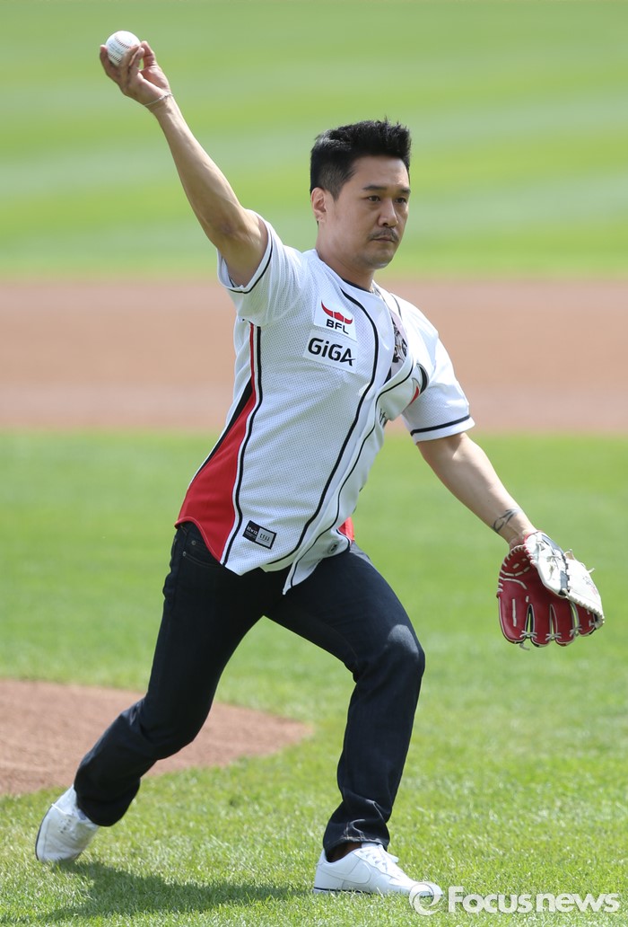 (서울=포커스뉴스) 8일 수원 kt위즈파크에서 열린 2016프로야구 한화-kt 경기에 앞서 가수 JK 김동욱이 시구하고 있다.