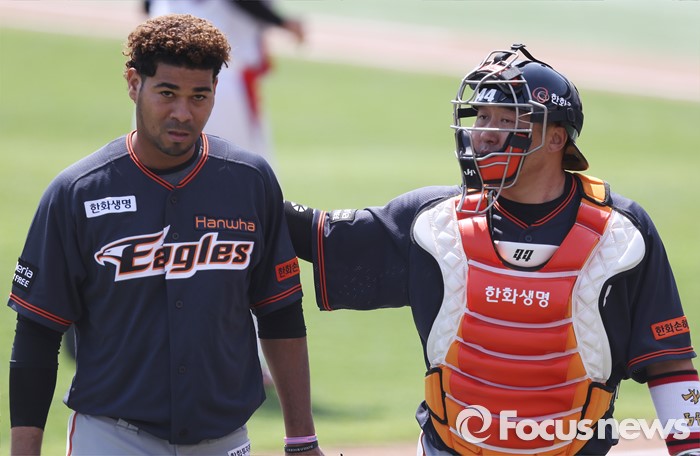 (서울=포커스뉴스) 8일 수원 kt위즈파크에서 열린 2016프로야구 한화-kt 경기에서 1회말 올 시즌 첫 등판한 한화 선발투수 로저스가 1회말을 삼자범퇴로 막고 포수 조인성과 함께 덕아웃으로 들어가고 있다.