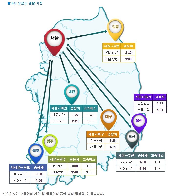 주요도시에서 서울까지 소요되는 시간은 오후 4시 기준 강릉 3시간, 부산 4시간 40분, 광주 3시간 40분, 목포 4시간, 대전 2시간 20분 등이다.