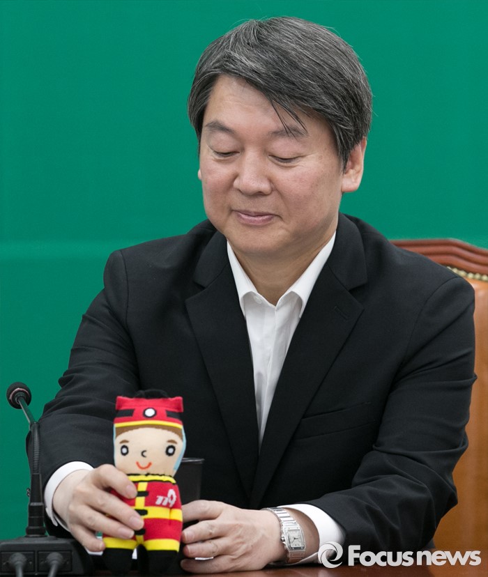 (서울=포커스뉴스) 9일 오전 서울 여의도 국회에서 열린 국민의당 최고위원회의에 참석한 안철수 상임공동대표가 국민대표 이윤정 소방경으로부터 받은 인형을 놓고 있다.
