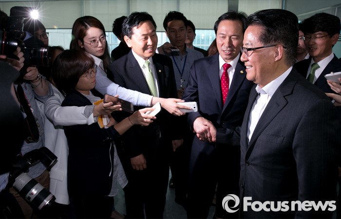 (서울=포커스뉴스) 우상호(왼쪽) 더불어민주당 원내대표가 9일 오전 서울 여의도 국회 의원회관에서 박지원 국민의당 원내대표를 예방, 면담을 마친 뒤 나와 취재진 앞에서 대화하고 있다.
