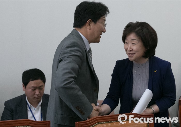 (서울=포커스뉴스) 9일 오전 서울 여의도 국회에서 열린 환경노동위원회 법안심사소위원회에 참석한 권성동(왼쪽) 소위원장과 심상정 정의당 상임대표가 인사하고 있다. 이날 환노위 법안소위는 가습기살균제의 흡입독성 화학물질에 의한 피해구제에 관한 법률안 및 가습기살균제피해구제법률안 등을 심사할 예정이다.