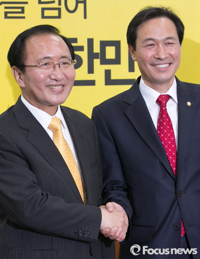 (서울=포커스뉴스) 우상호(오른쪽) 더불어민주당 원내대표가 9일 오전 서울 여의도 국회에서 노회찬 정의당 원내대표를 예방, 취재진을 향해 포즈를 취하고 있다.