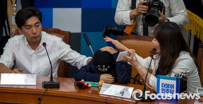 (서울=포커스뉴스) 9일 오전 서울 여의도 국회에서 열린 '더불어민주당, 가습기살균제 대책특위 1차회의'에 참석한 가습기살균제 피해 가족 권미애(오른쪽) 씨가 발언 하고 있다.
