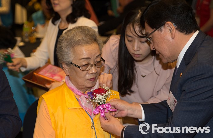 (서울=포커스뉴스) 9일 오전 서울 종로구 세종문화회관에서 열린 '2016 어버이날 孝 사랑 큰잔치' 에 참석한 정진엽(오른족) 보건복지부 장관이 한 어르신께 카네이션을 선물하고 있다.
