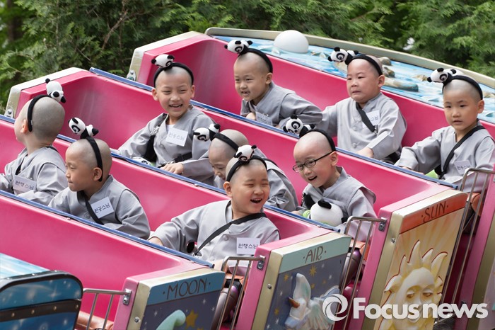 (용인=포커스뉴스) 9일 오전 경기도 용인시 에버랜드에서 동자승들이 놀이기구를 타며 즐거운 시간을 보내고 있다.