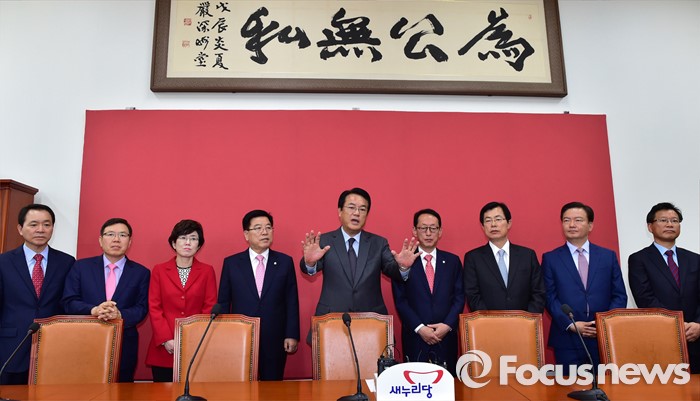 (서울=포커스뉴스) 정진석(왼쪽 세번째) 새누리당 원내대표가 9일 오전 서울 여의도 국회에서 열린 신임 원내대표단과의 티타임에 참석해 모두발언을 하고 있다.